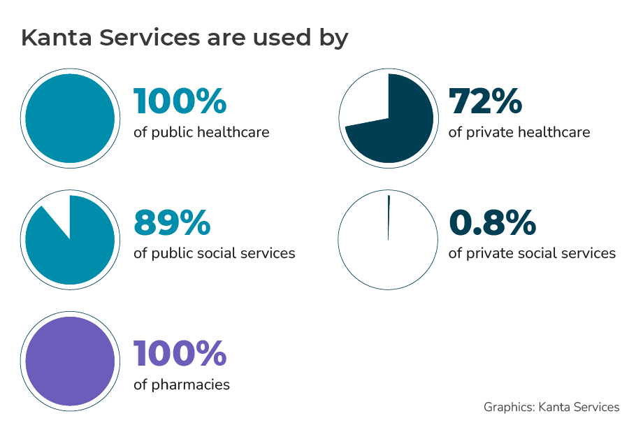Today, all public and private healthcare organisations and pharmacies use the Prescription service, which was launched in 2010. In public healthcare, the Patient Data Repository is used by all operators. Two-thirds of private healthcare providers use the Patient Data Repository. The implementation of the Client Data Repository for Social Welfare Services is currently progressing in stages in both public and private social welfare services. Social welfare data has been stored in Kanta since 2018.