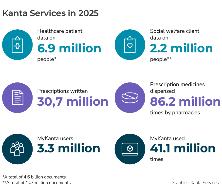 The Kanta Services are used comprehensively by both public and private social welfare and health care providers. Kanta combines patient and client data from health care and social welfare into an aggregate form. In total, more than two million new documents are stored in the Kanta Services every day.