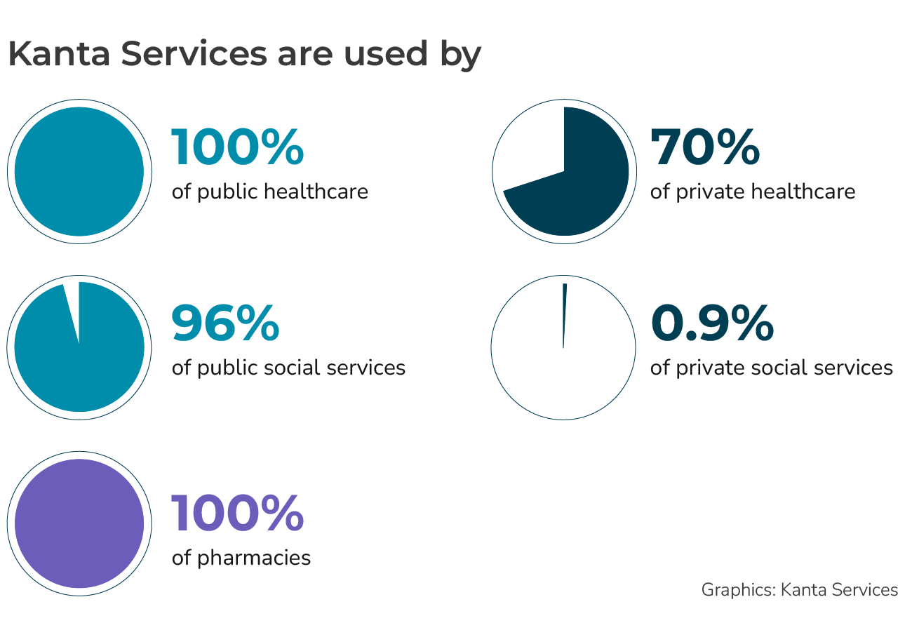 Today, all public and private healthcare organisations and pharmacies use the Prescription service, which was launched in 2010. In public healthcare, the Patient Data Repository is used by all operators. Two-thirds of private healthcare providers use the Patient Data Repository. The implementation of the Client Data Repository for Social Welfare Services is currently progressing in stages in both public and private social welfare services. Social welfare data has been stored in Kanta since 2018.