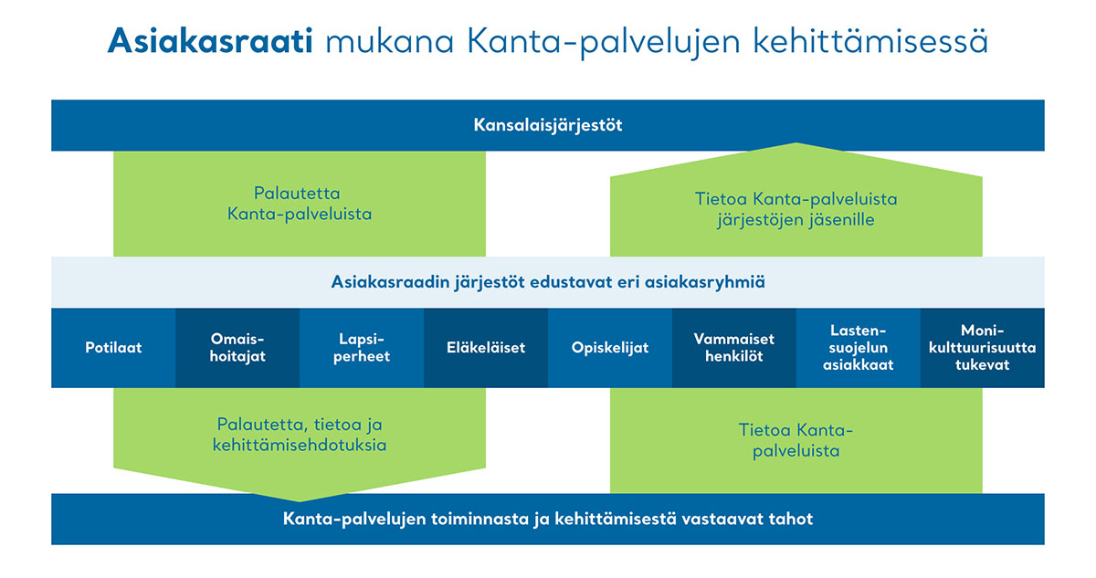 Asiakasraadin merkitys on myös vastavuoroinen: sen lisäksi, että järjestöt tuovat tietoa ja palautetta, he vievät viestiä Kanta-palveluista eteenpäin omille jäsenilleen. Asiakasraadin jäsenten kommenttien pohjalta on myös parannettu Kanta-palvelujen painetun viestinnän ymmärrettävyyttä.