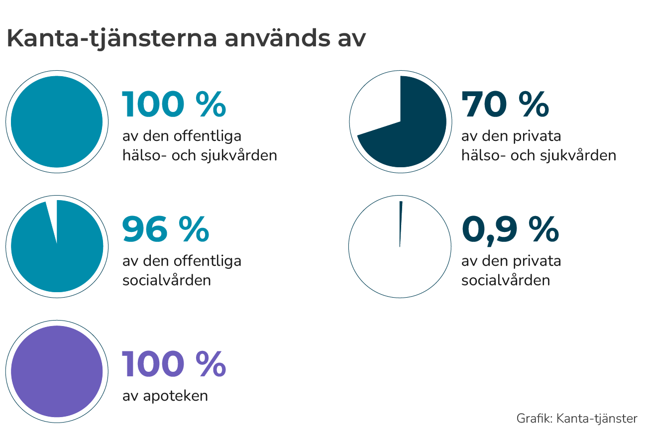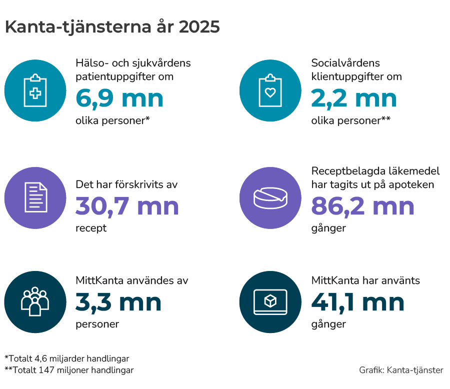 Kanta-tjänsterna används heltäckande både inom den offentliga och den privata social- och hälsovården. Kanta-tjänsterna sammanför patient- och klientuppgifter inom social- och hälsovården. I Kanta-tjänsterna införs totalt över två miljoner nya handlingar varje dag.