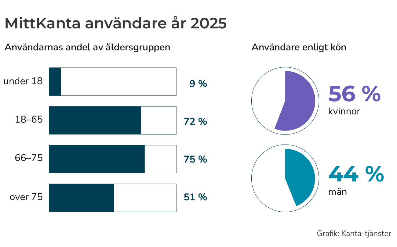 Största delen av finländarna använder MittKanta. År 2025 användes MittKanta av 3,3 miljoner personer sammanlagt 41,1 miljoner gånger.
